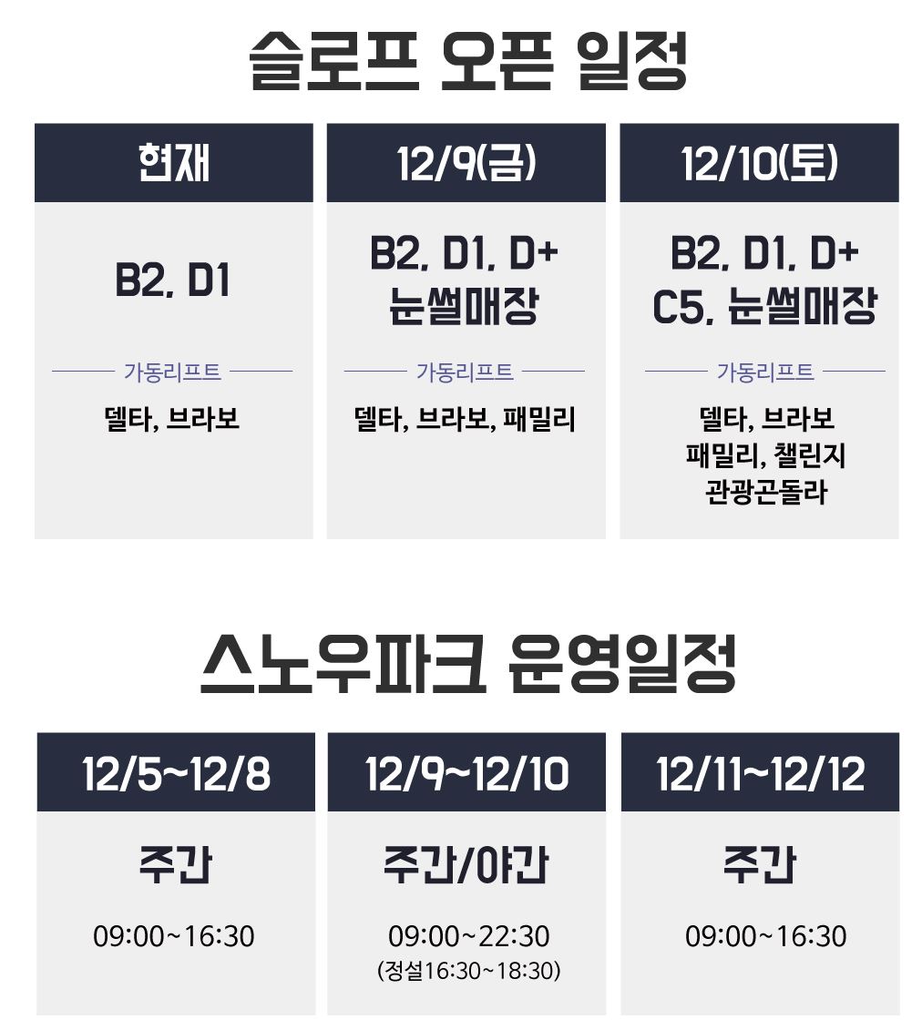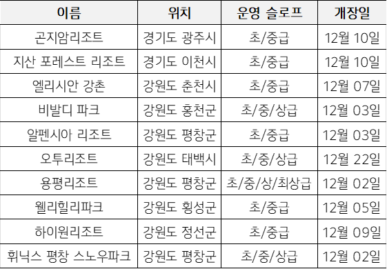 스키장 개장일 및 오픈된 슬로프 정보, 그리고 이용 가능한 시간을 정리해봤다.