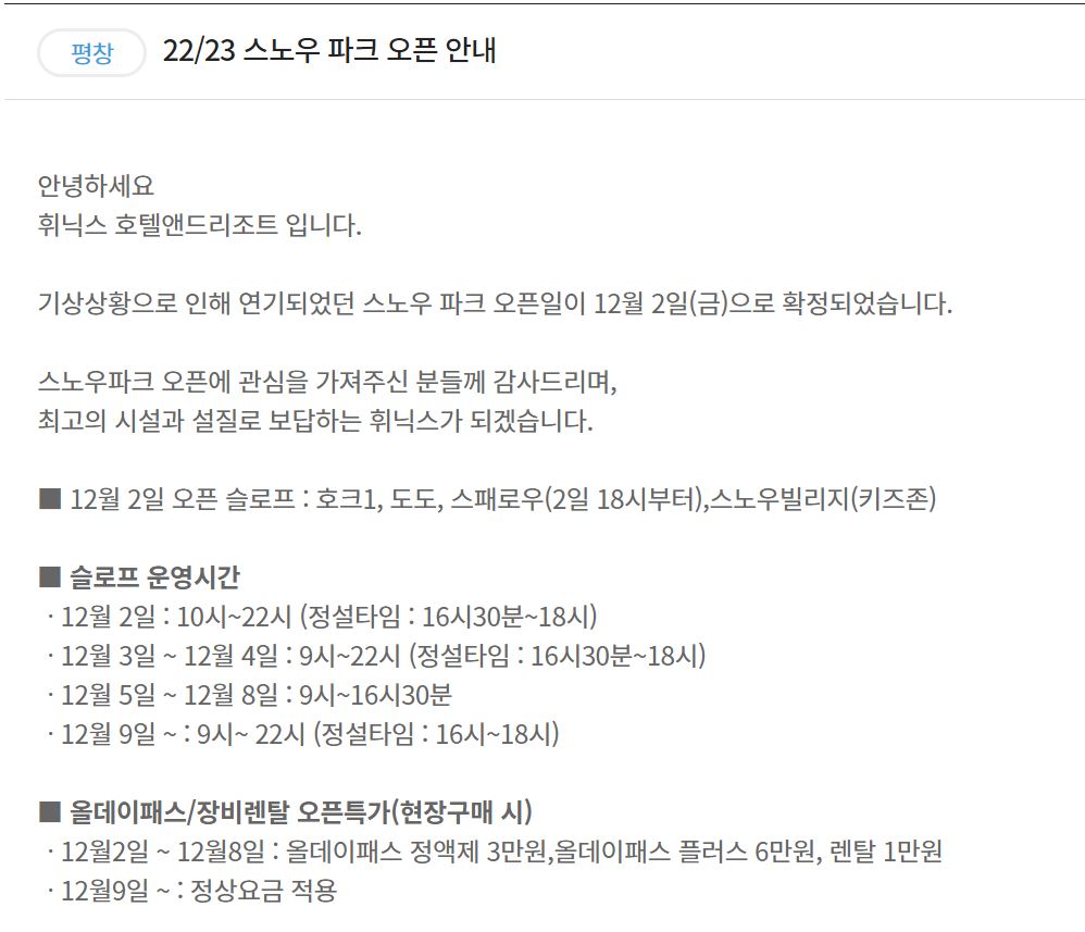 평창 휘닉스 파크는 12월 2일부터 오픈해서 운영 중이며,